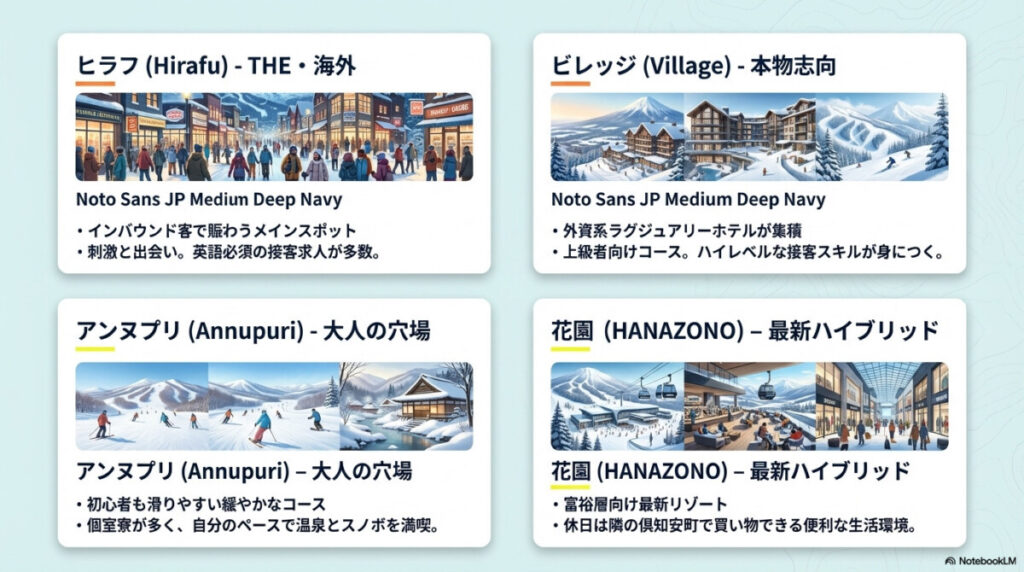ニセコエリアの求人を探す上で、どのスキー場周辺で働くかを選ぶことは非常に重要です。
