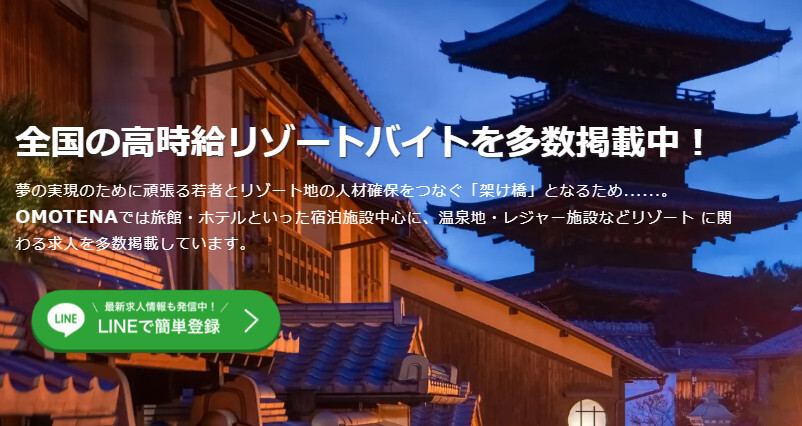 OMOTENA(運営:スタッフエージェント)は、温泉地や歴史ある観光地で働きたい方に特化した派遣会社です。ホテルや旅館の求人に圧倒的な強みを持ち、接客未経験でも応募できる案件が豊富に揃っているからです。
