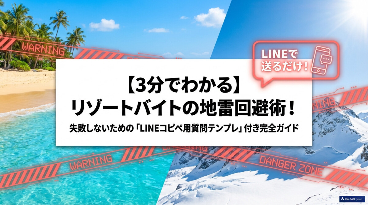 本記事では、そのままLINEに貼り付けて使える「地雷回避用の質問テンプレート」をご用意しました。今すぐテンプレートを活用して、安全で最高のリゾートバイト生活を手に入れましょう。