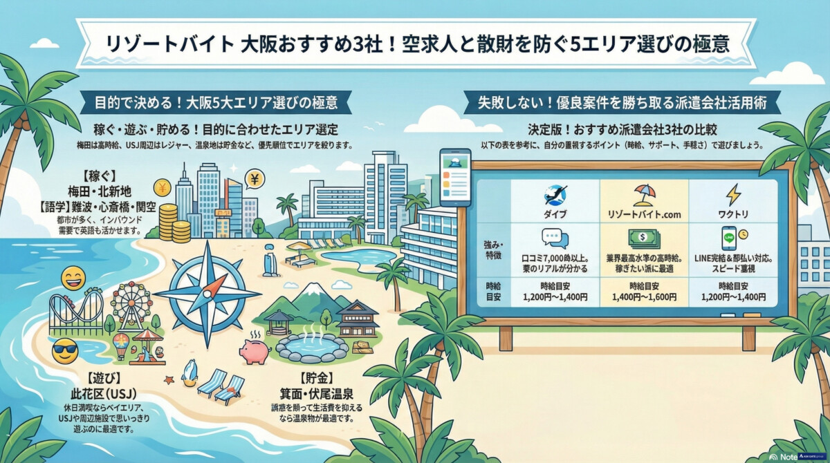 大阪のリゾートバイトは、働く目的によって選ぶべきエリアと派遣会社が大きく変わります。