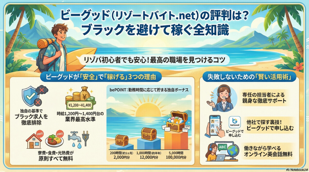 初めてのリゾートバイト。「見知らぬ土地での住み込み生活で、人間関係が悪いブラック職場に当たったらどうしよう…」「事前に聞いていた条件と全然違ったら…」と不安に感じていませんか?ネットで派遣会社を調べていて「ビーグッド(リゾートバイト.net)」の予測変換に「やばい」という言葉が出てきて、登録をためらっている方も多いはずです。