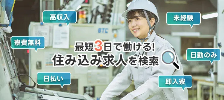 敷金や礼金といった初期費用が一切かからず、応募から最短で即日入寮できる求人が揃っています。